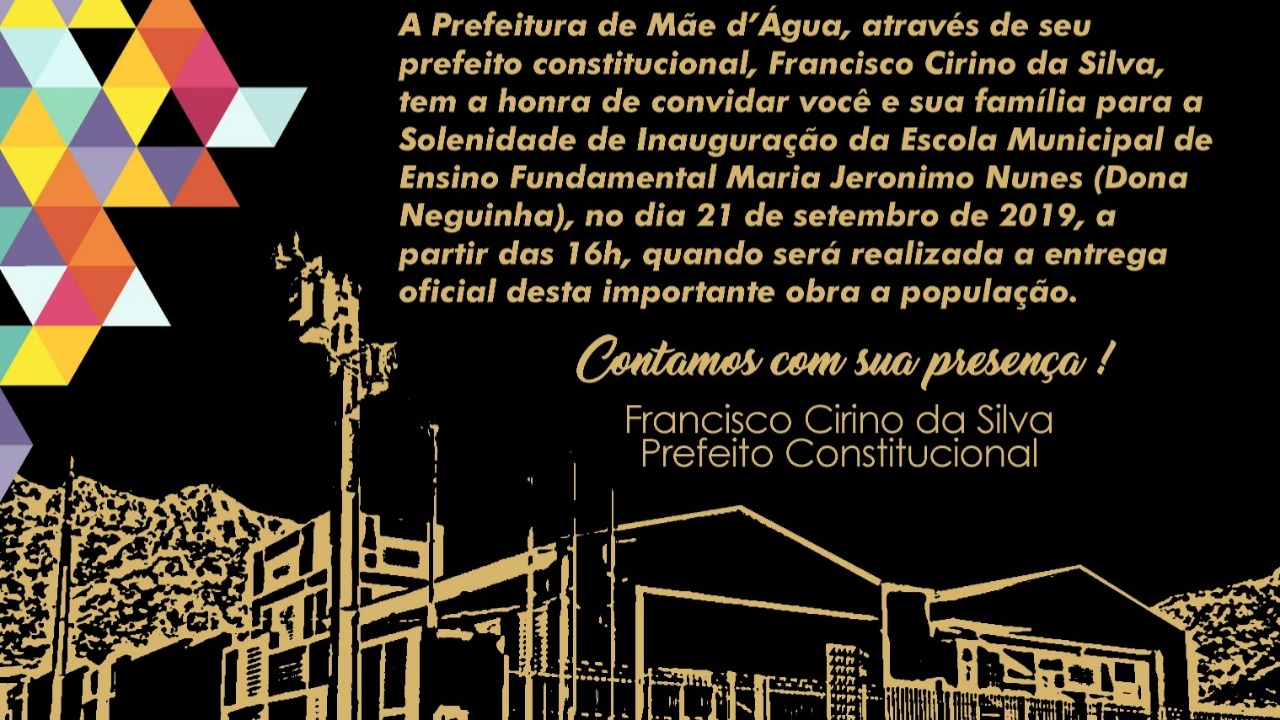 “Este é um momento de festa para nosso município e, principalmente, para a população, que recebe um equipamento amplo, moderno e ganha um prédio funcional e também muito bonito, onde nossos alunos e servidores terão maior conforto e muito mais espaço para desenvolver todas as suas atividades. Por isso, desde já, convido todos a, junto comigo, com o secretário Aléssio Trindade, com a primeira dama Lúcia Nunes e todos os familiares da homenageada, e com nossa secretária de Educação Vania Campos, participarem conosco da solenidade de entrega oficial a Secretaria de Educação e a população da Escola Municipal Maria Jerônimo Nunes