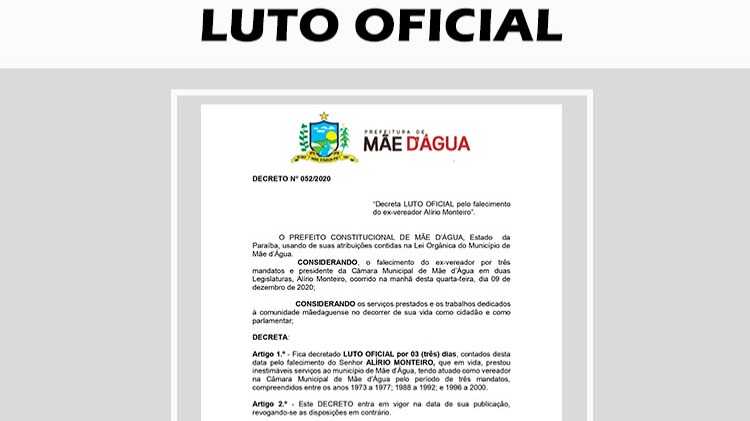 O prefeito Francisco Cirino da Silva, fazendo uso de suas atribuições, baixou o Decreto 052/2020, que institui o Luto Oficial de três dias pelo falecimento do ex-vereador e presidente da Câmara Municipal de Mãe d’Água, Alírio Monteiro.