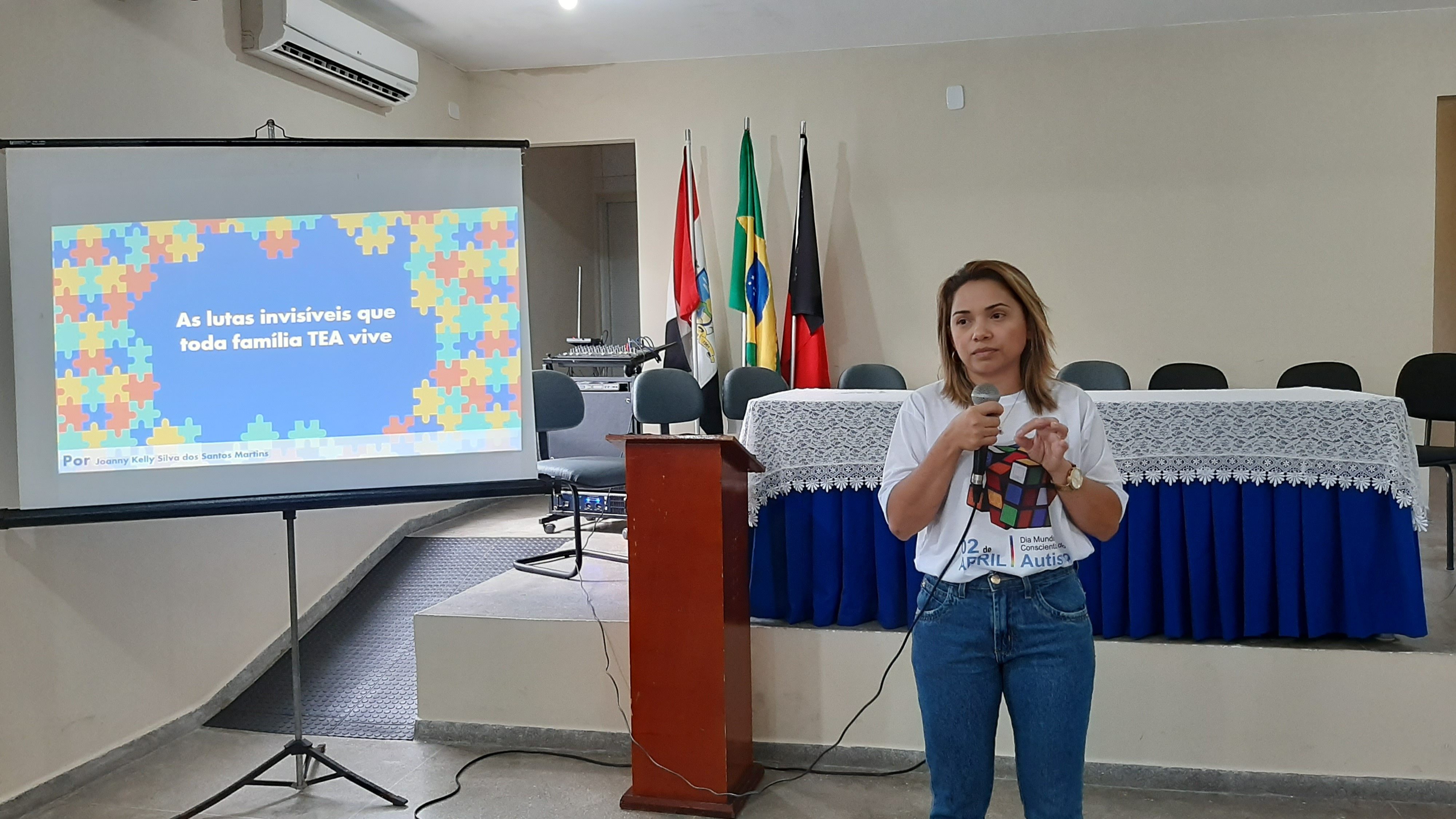 O evento, realizado através do Núcleo de Apoio Pedagógico Especializado (NAPE), com apoio logístico e irrestrito da Secretaria Municipal de Assistência Social e das Secretarias de Educação, Saúde e de Infraestrura, iniciou no Auditório Municipal, onde foi realizada a abertura solene e palestra com a bióloga, mãe e esposa de autista, Joanny Kelly, que falou sobre sua experiencia em família durante a exposição da palestra “As Lutas Invisíveis que toda Família TEA Vive”.
